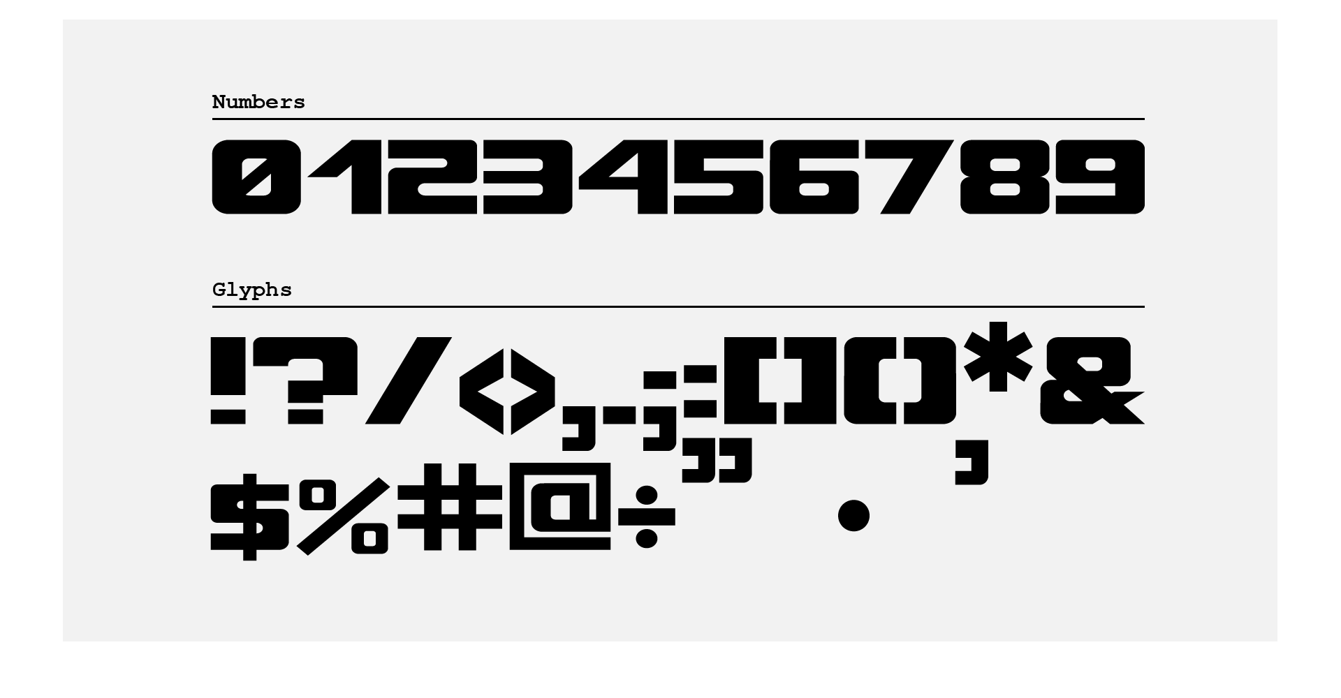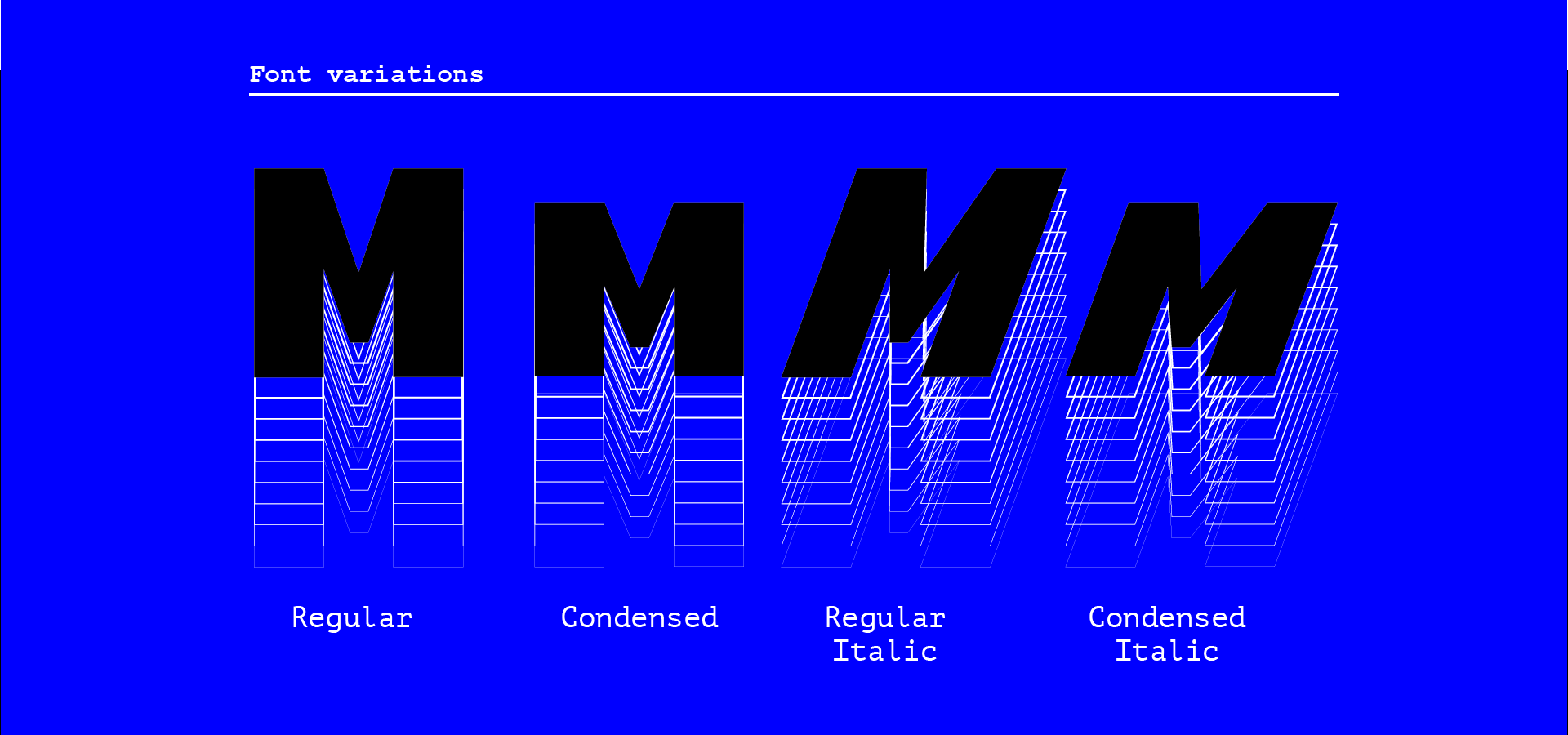 The typeface includes 26 Latin characters, numbers from 0 to 9 and glyphs available in 4 variations: Regular, Regular-Italic, Condensed and